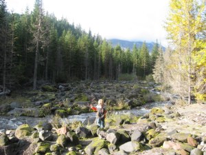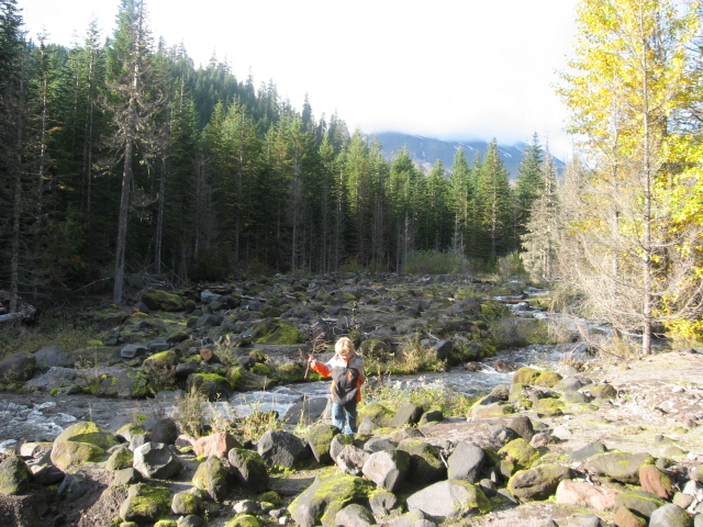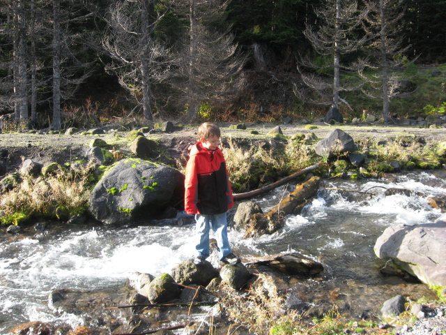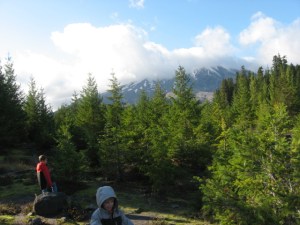 So, we were supposed to go to Mt. Hood (I thought). We had briefly discussed going to Mt. St. Helen’s but I thought it was vetoed due to the time it takes to get there. I also thought there would be more stuff to do at Mt. Hood. Anyway, Fred decides to go to Mt. St. Helen’s, but doesn’t tell me so I can look up things and plan. He got gps directions to “Mount St. Helens” literally the summit. I wanted to go to Johnston Observatory and Learning Center were it is all about volcanoes and stuff. But since I thought it was vetoed, I never looked it up. His phone ran out of batteries and my 3G cut out in the mountains. So we got lost, kids (and I) were car sickish, and I had to literally monitor how lost I was going to let us get before I called it quits. I mean, he was going on logging roads, which can be dangerous if you don’t know what you are doing and I did not want to be stuck in logging roads after dark with no cell phones. So, we ended up just stopping at a couple of lookout places and then walked along a trail by a river that seemed to be called “June Lake.” Then went home. A long time in the car for not very much volcano. We ended up seeing sort of the back side of St. Helens, but not much of the volcanic distraction and stuff. I will say that everyone did a good job of making the best of it and being patient.