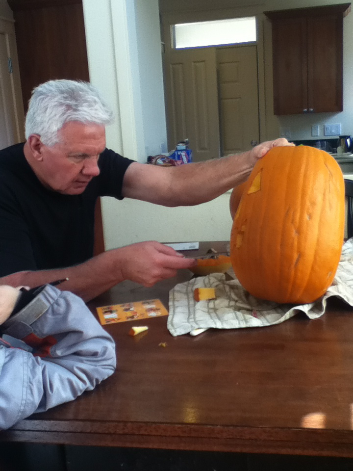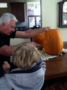 Kids carved pumpkins with Grampa Fred. That seemed to go ok (I was not here.) Aaron decided he didn’t like his, not sure why. It doesn’t light up as well as Naim’s because I think the holes aren’t big enough. Avery did not get to paint his yet.