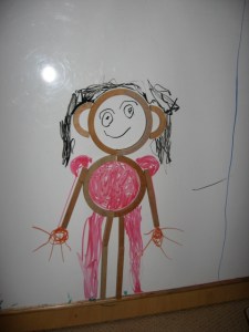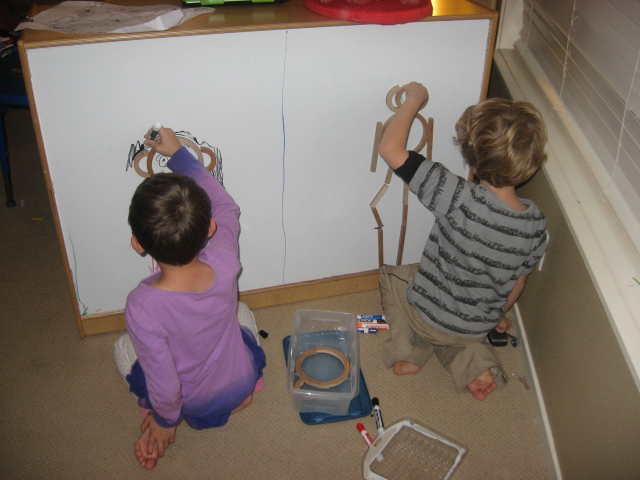 - Read Mat Man on the Go, Made Mat Man figures on white board. This was my attempt to get them to do better on the “draw a picture of yourself” test, which they blew off when they had to do it at the end of the last handwriting book. They did much better today.