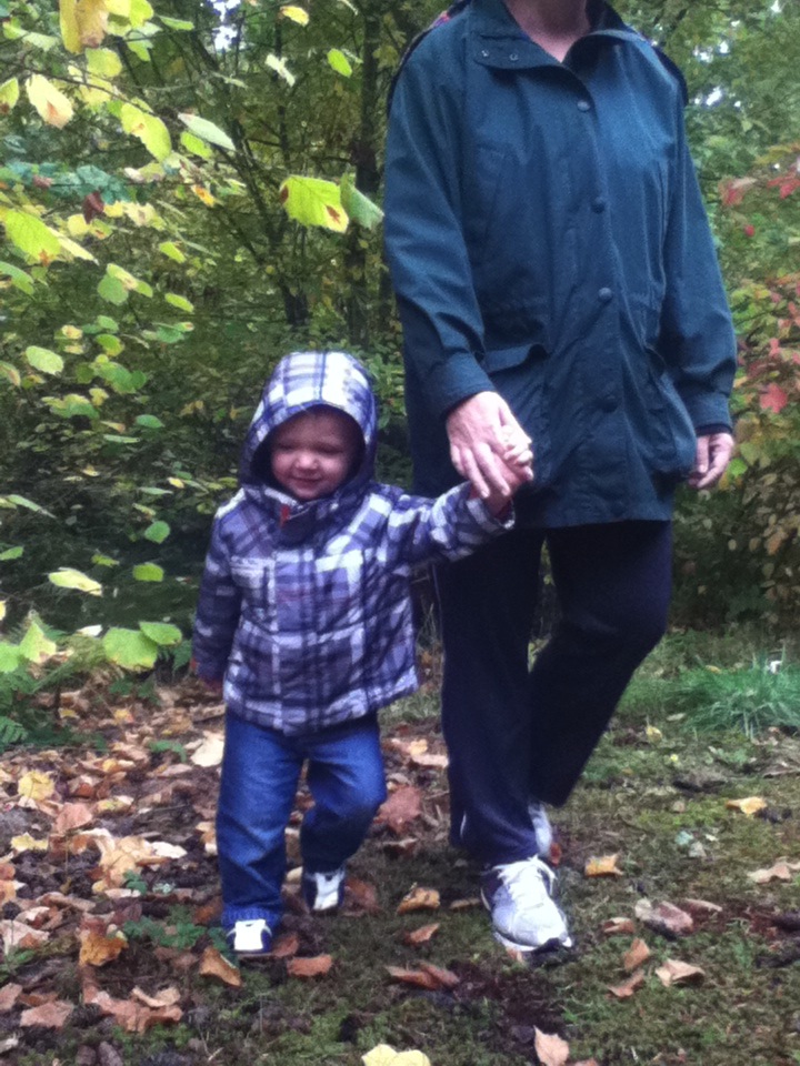 Nik and I took Avery for a walk behind the houses. He really likes to walk and did investigate some trees and mosses and stuff. Went briefly to the Tot Lot. He likes the steering wheels but was not NEAR so obsessed with them. We could redirect him to other things. We were going to walk back on the street side, but he wanted to go on the paths behind the houses again. He pointed in that direction. He is getting some basic pointing or gesturing down. He still does not look to where you point.