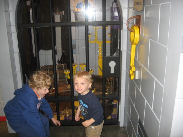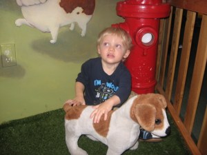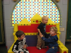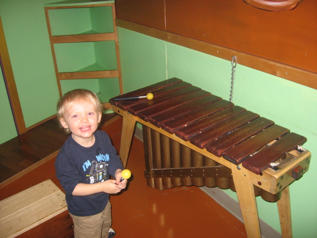 It has been about three months, and although he still isn’t in the developmental norm, the difference has been pretty outstanding. Today, he stuck by me a lot, but he interacted with everything and seemed a lot more like a normal toddler playing. He still doesn’t “cover the ice surface” so to speak and check everything out like a lot of kids do, but his circle has expanded and he is much more willing to try new things. He also seems to understand the context of things more, like grocery shopping or playing with a stuffed dog. There was still some obsessing with wheels, like he spent a ton of time turning these wheels that turned these lego castle displays around, but he also went over and tried the slide, built for a few seconds with giant lego blocks, and looked around at what else was out there. He still has quirks, like he went around and became obsessed with all the hinges in the doors. He stole a small screw that came out of a hinge in a small gate and would not let it go. But he was much easier to distract and get interested in something else. He went crazy with Naim in the theater and loved the xylophone, something that I could not get him interested in before. (Before, when I took him to the theater, he walked back and forth, back and forth across the stage nonstop.) This time, he played with the xylophone and ran around on stage with Naim.