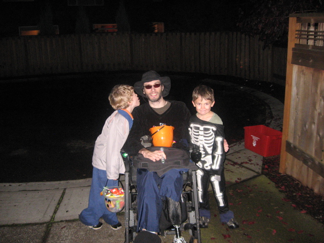 Dwight showed up as we reached the last house for trick or treating. Kids were happy. He made a "bionic leg" out of his prosthesis.