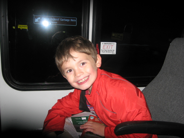 On the bus on the way home. They said this bus was like the airplane but without wings and on the ground.