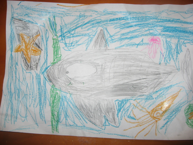 Aaron does his “Bob Ross” Show where he draws a picture while pretending to be on TV and telling us how he draws it as well as trivia about the subject matter which is usually animals. Today it was an Orca whale and some other sea life. I think his animal knowledge is pretty accurate. He also says his show is “Sponsored by The Portland Nursery, Chick-fil-A, The Corporation for Public Broadcasting, and Viewers Like You.”