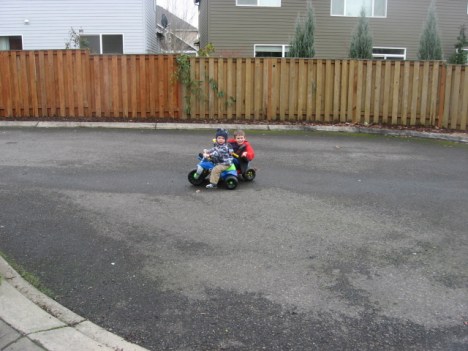 Also, I’ve been trying to get some kind of outdoors/physical activity going for a half hour after lunch before Avery’s nap that not only burns off energy for them but would be SOME kind of exercise for me. I do not understand why there is all this stuff for parents (fitness classes, etc.) where you have to find childcare for your kids and then you take your kids to whatever class or sport, and sit there bored while they do their physical activity. I mean, sure, those should be options, but why not an option where the whole family could do something together? Like casual all ages soccer or Zumba slowed down just a tad for kids, martial arts for all ages…etc. I guess we shall make up our own as we go. Today we just did big wheels and some running in the alley. It was ok, but I need some different ideas. Time to go online and ask the homeschoolers.