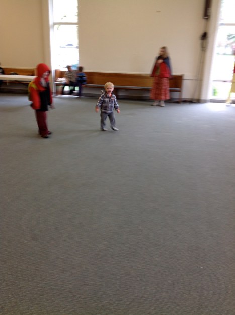 Avery running around in the room where Aaron has Legos and also another class does PE type of things.