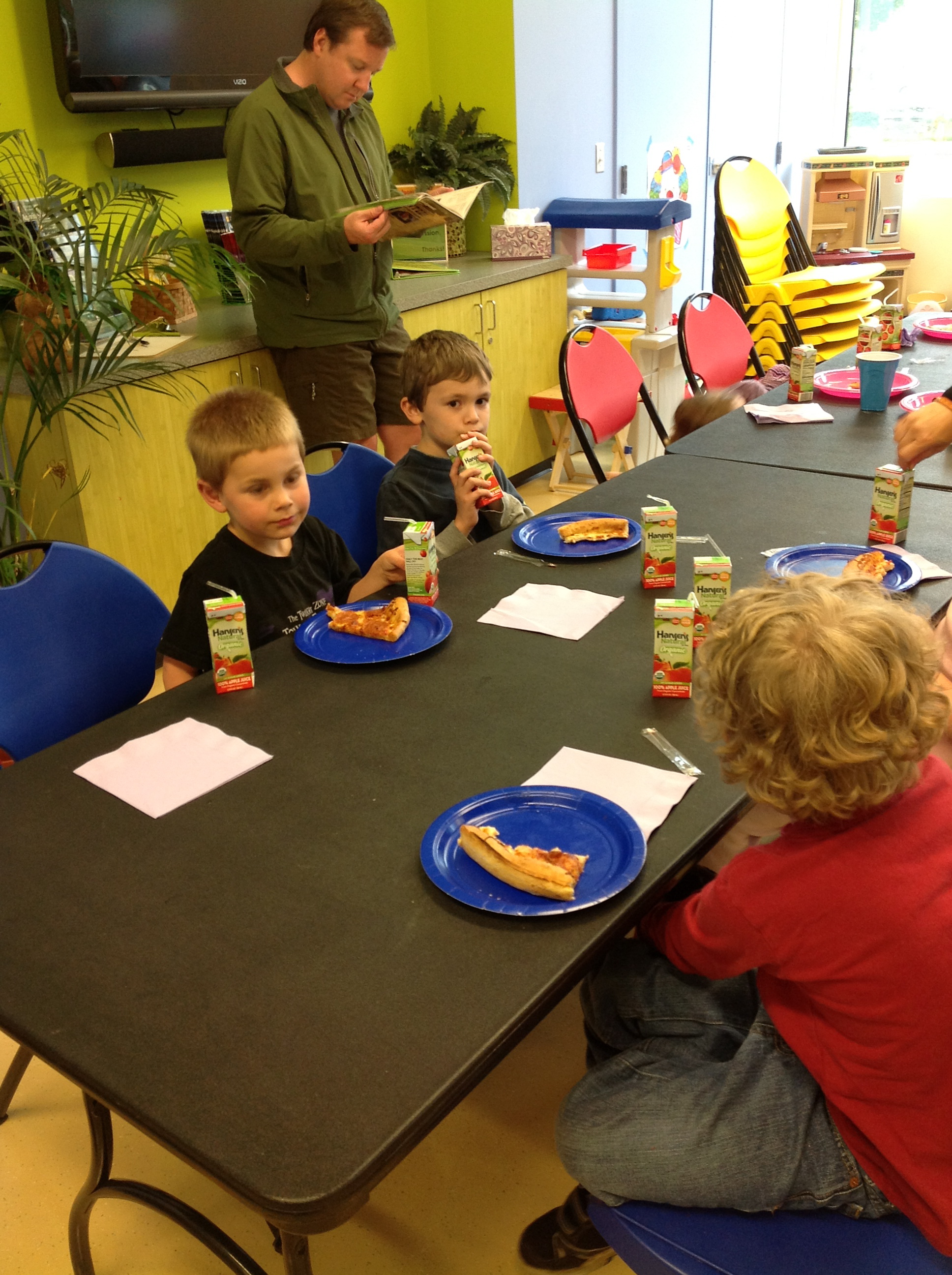 We came home and then went to M.L. birthday party at Outdoors In. We were supposed to go early and get a present from Let’s Play, but it was closed. So now we owe her and IOU present. Everyone did good at the party. Including me. I kicked myself out of my cacoon even though it was VERY LOUD and I couldn’t hear and talked to several moms. Met a new one whose kid is in Naim’s classes at VH and they hung out together. Will try to invite her to summer party. (Part of homeschooling for me is to be a good playdate mom, something I tend to suck at. So trying to step it up.)