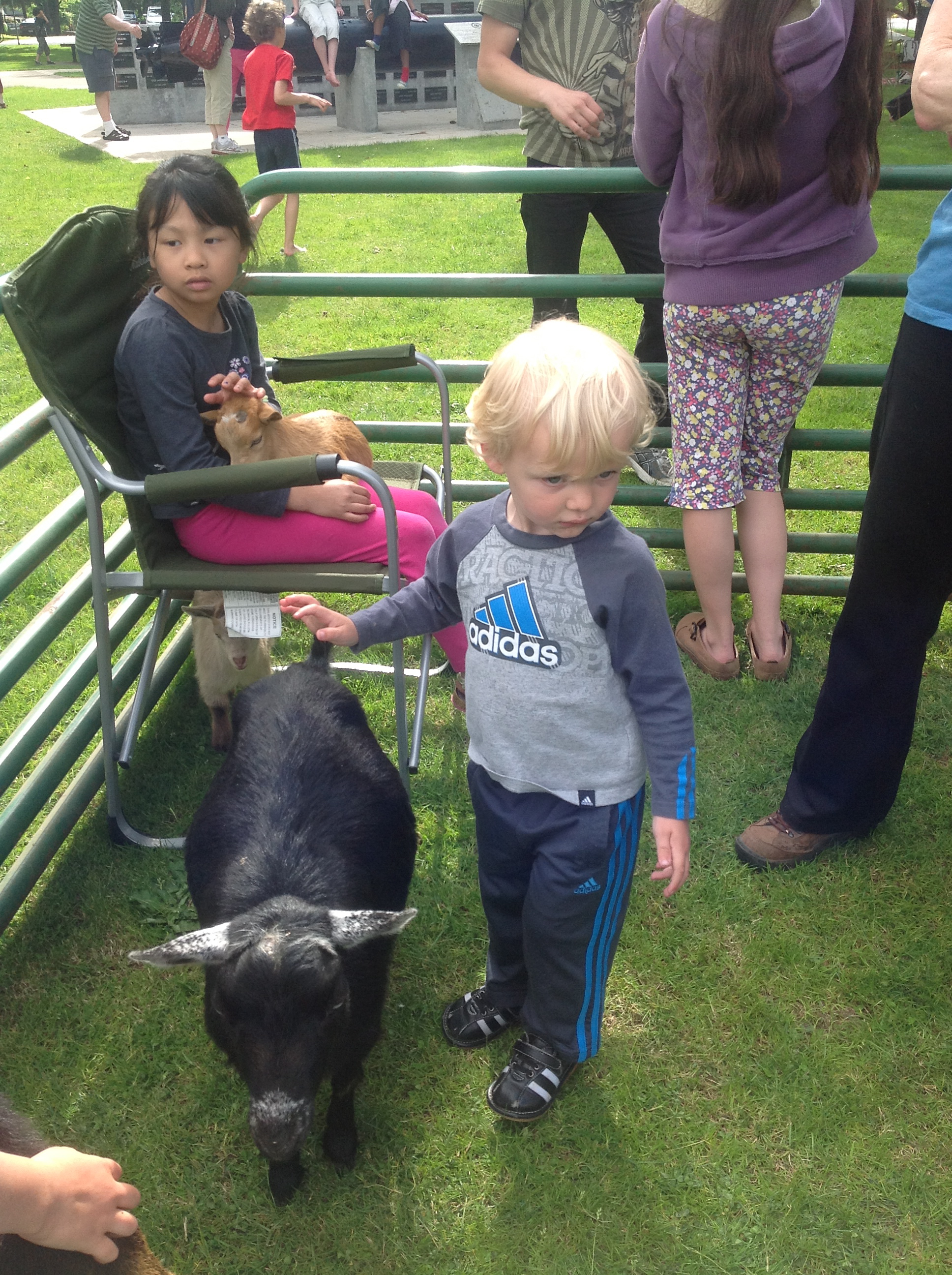 I’m not sure the main draw here was the goats or just climbing the fence. (Which he can do, no problem.) I think he thought they were dogs.