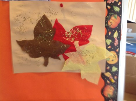 The art project was gluing tissue paper leaves on paper and then brushing them with a glitter solution using a paintbrush.