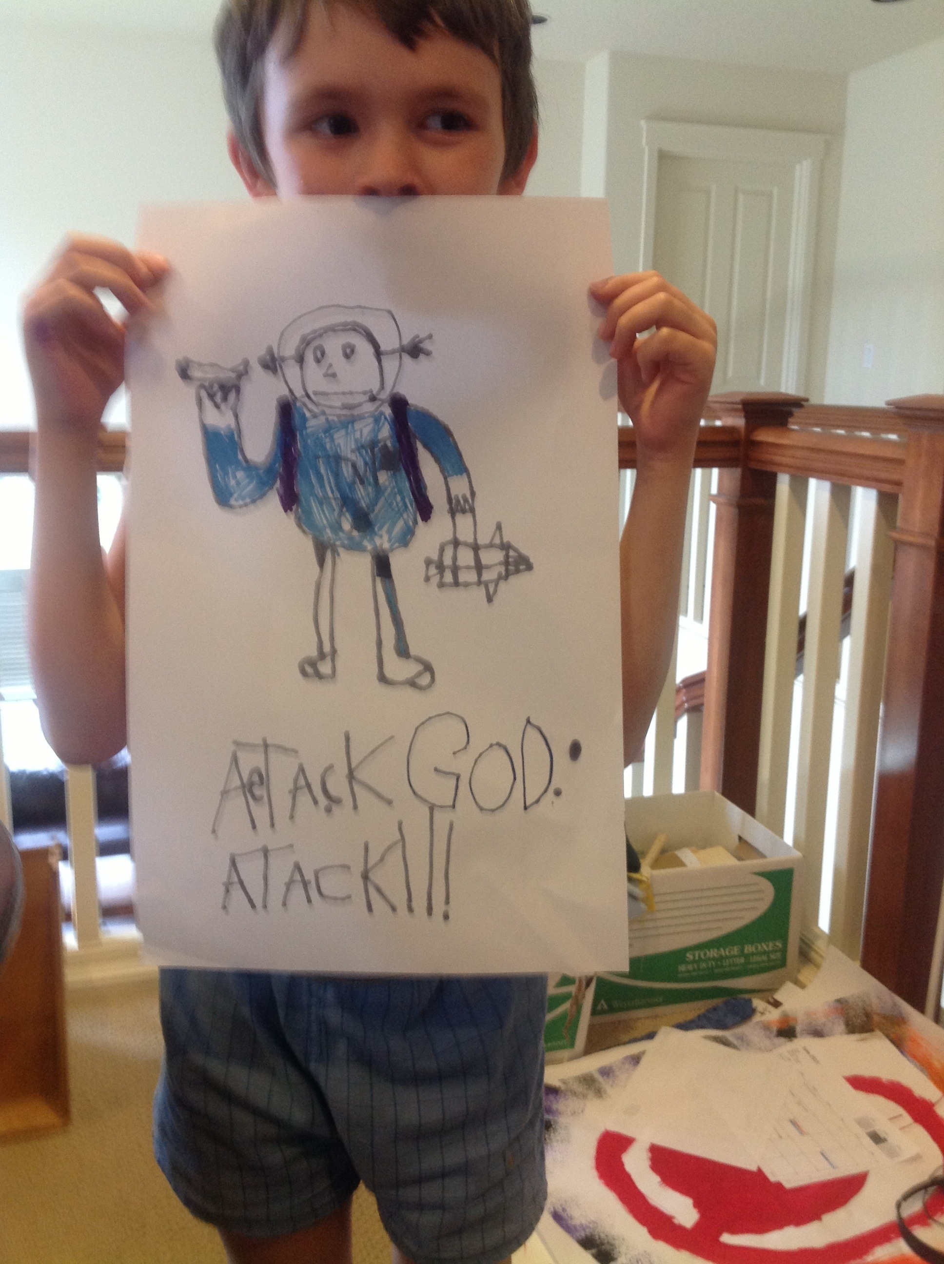 I did not get to these pics until they had spiralled into war-games. Sigh. I asked him what “Attack, God, Attack” meant. He said he was using God as an expletive (as opposed to saying that he wanted to attack God, which is worse?) Who knows? Le sigh.
