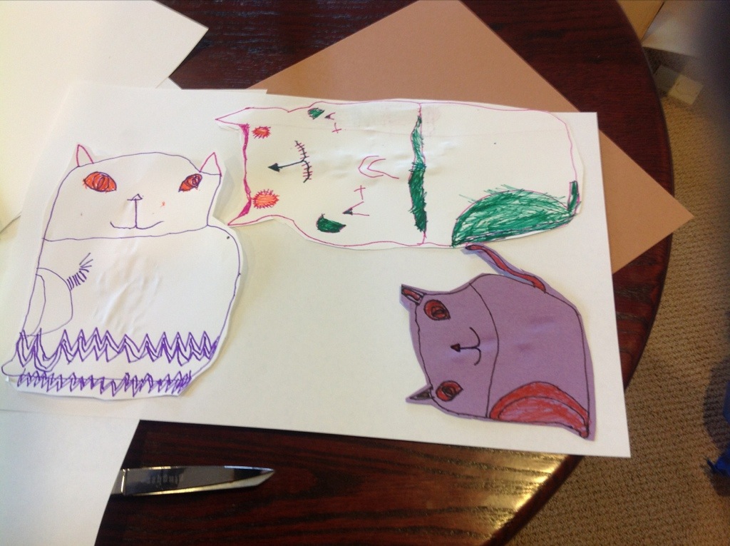 This is Aaron’s project. He refused to do dogs, so they are all cats. They are a zombie cat, a ghost cat, and a Holloween cat. He did not really layer them in a way that shows perspective like they wanted (a cat in front, a cat behind…) But he didn’t want to glue them on at all.